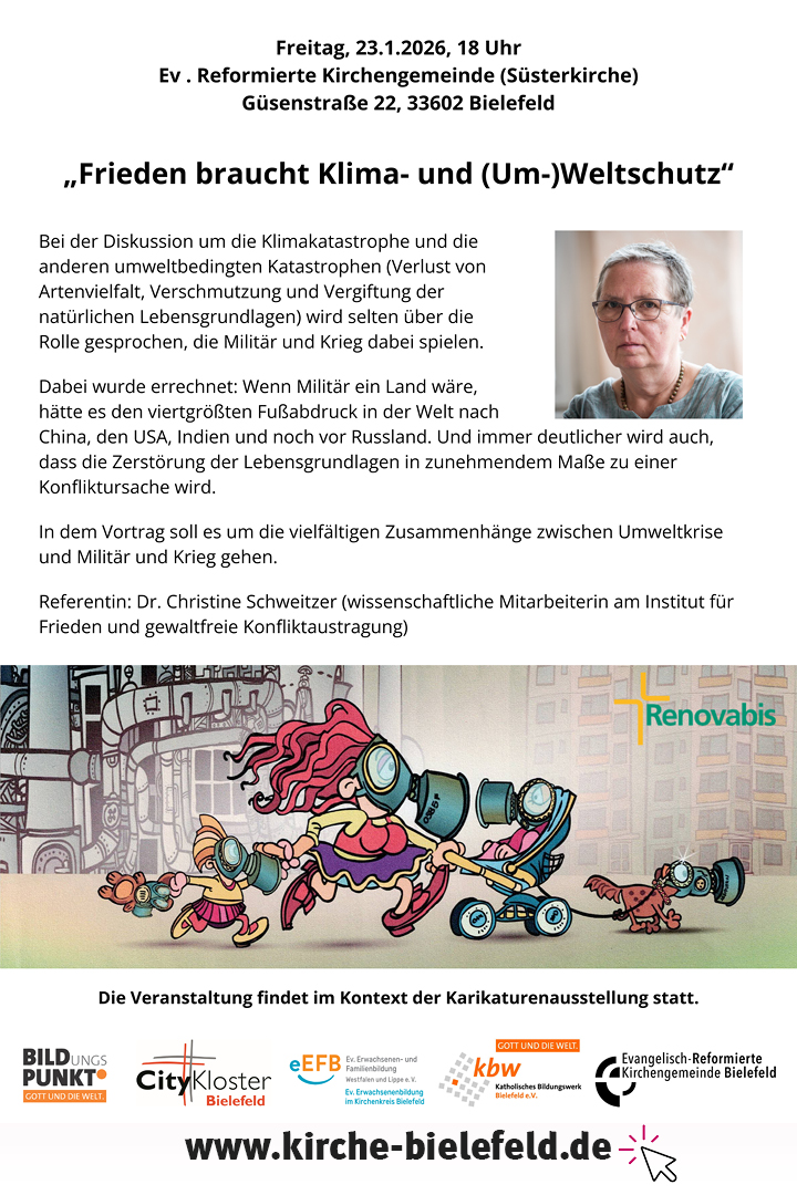 Bei der Diskussion um die Klimakatastrophe und die anderen umweltbedingten Katastrophen (Verlust von Artenvielfalt, Verschmutzung und Vergiftung der natürlichen Lebensgrundlagen) wird selten über die Rolle gesprochen, die Militär und Krieg dabei spielen. Dabei wurde errechnet: Wenn Militär ein Land wäre, hätte es den viertgrößten Fußabdruck in der Welt nach China, den USA, Indien und noch vor Russland. Und immer deutlicher wird auch, dass die Zerstörung der Lebensgrundlagen in zunehmendem Maße zu einer Konfliktursache wird. In dem Vortrag soll es um die vielfältigen Zusammenhänge zwischen Umweltkrise und Militär und Krieg gehen.